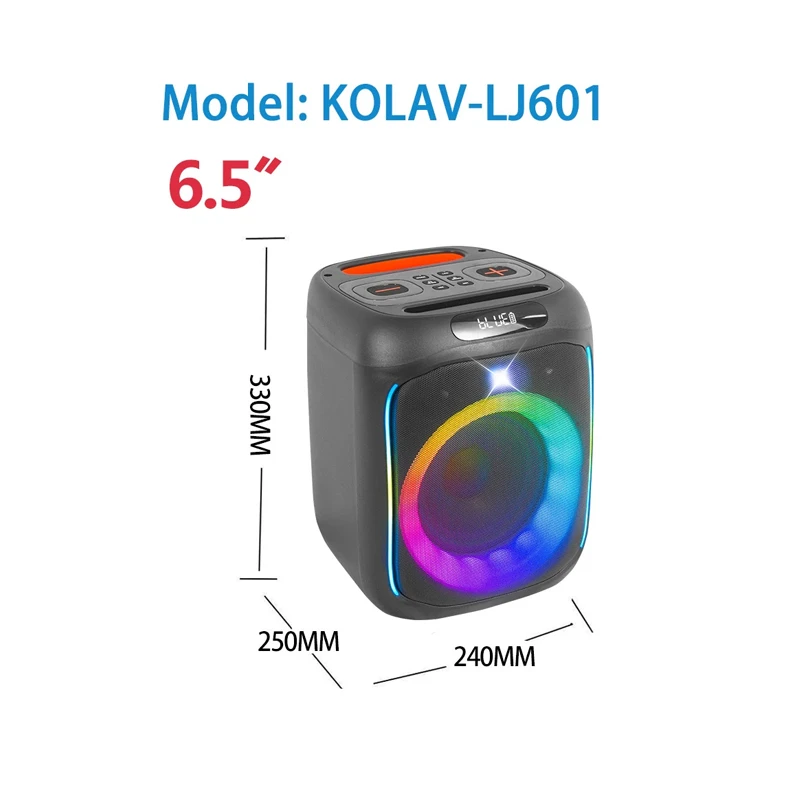 • ابعاد و وزن: نام “قابل‌حمل” نشان می‌دهد که اسپیکر KOLAV-LJ601 باید به‌اندازه‌ای کوچک و سبک باشد که به‌راحتی در کوله‌پشتی یا کیف حمل شود. ابعاد ۲۷۵×۲۸۵×۳۸۰ میلی‌متری و وزن 6000 گرم آن این اسپیکر را در رده اسپیکرهای قابل‌حمل قرار داده است.