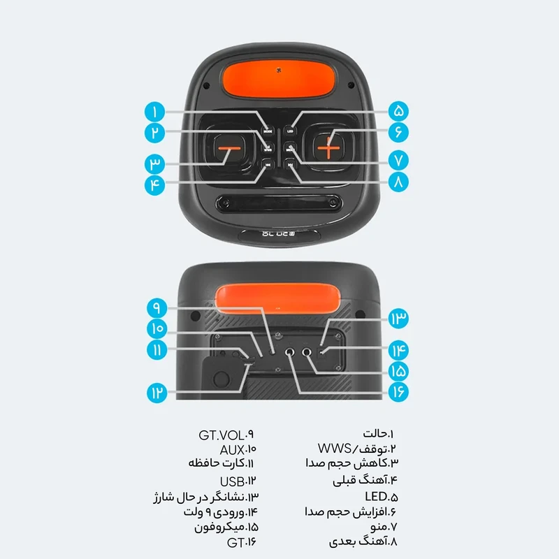 • نوع و پورت شارژ: اکثر اسپیکرهای مدرن از پورت USB-C برای شارژ استفاده می‌کنند که سریع‌تر و راحت‌تر است. برخی مدل‌های قدیمی‌تر ممکن است از Micro-USB استفاده کنند. اسپیکر دارای پورت‌های USB، شیار کارت حافظه Micro-SD و درگاه 3٫5 میلی‌متری AUX است.