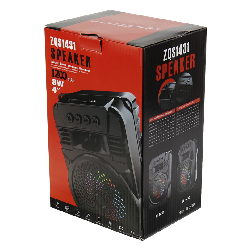 • قابلیت‌های اضافی: برخی از اسپیکرها دارای ویژگی‌های اضافی مانند رادیو FM، پورت USB برای پخش موسیقی از فلش درایو، ورودی کارت حافظه (TF Card) و میکروفون داخلی برای پاسخ به تماس‌ها هستند. اسپیکر ZQS1431 دارای پورت USB و بلوتوث است.